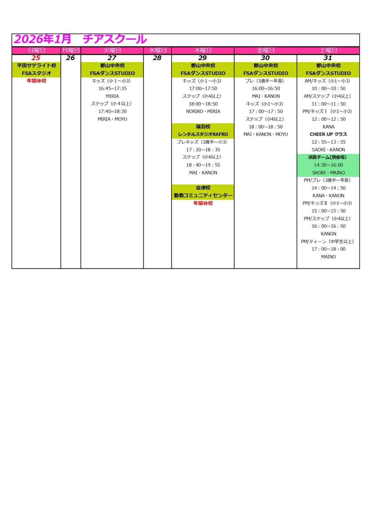 【月間スケジュール】2026年1月度