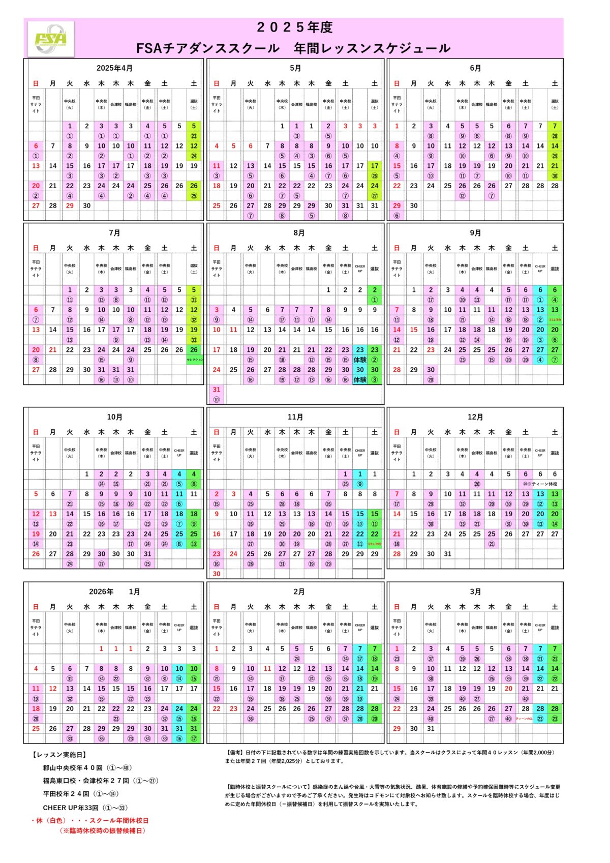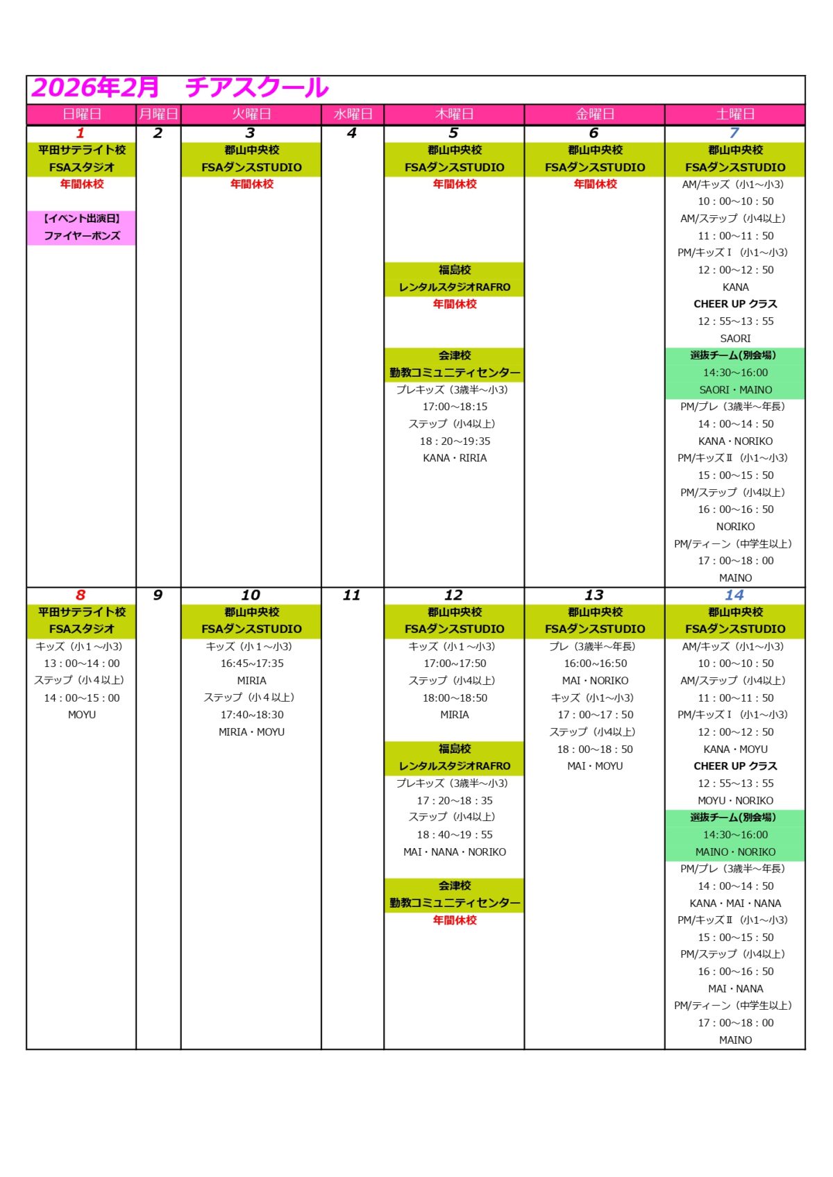 | 日曜日 | 平田サテライト校 | FSAダンスSTUDIO(イオンタウン郡山) ※年間24回レッスン開催 プレキッズクラス(3歳半~小3)13:00~14:00 ステップクラス(小4~小6)14:10~15:10 |